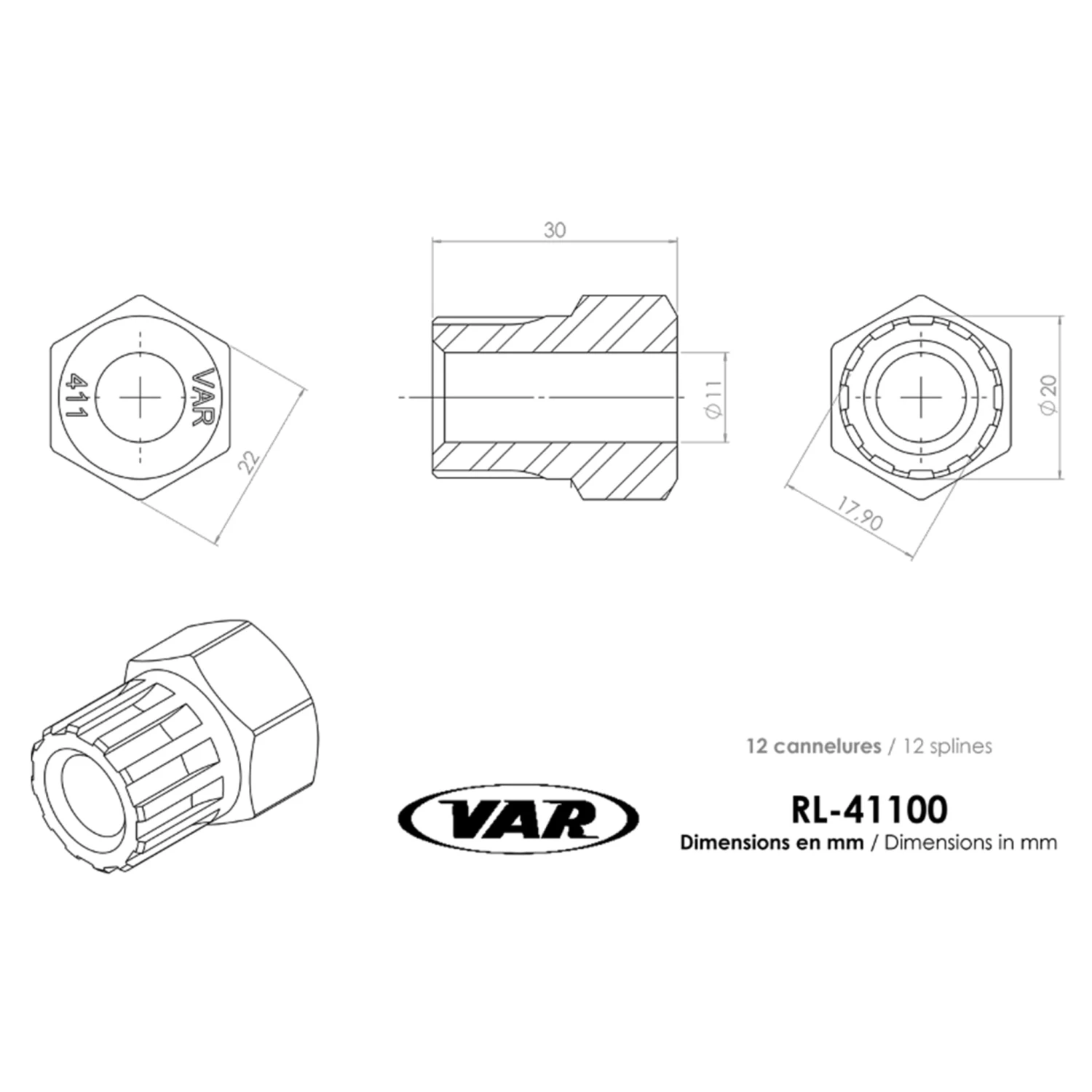Le modèle RL-41100 permet de démonter les roues-libres 12 cannelures, compatible avec les marque Shimano, Tiger ou Falcon. Le diamètre à l’intérieur des dents est de 17.90 mm et à l’extérieur de 20 mm. Le produit s’utilise avec une clé plate de 22 mm. Il pèse 58 grammes.