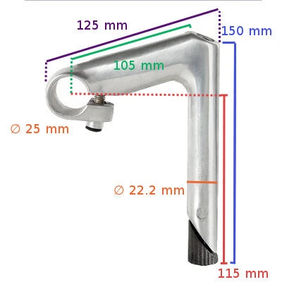 Cette potence à plongeur est en aluminium, couleur argent poli. Elle convient aux vélos avec un tube de direction de 22.2 mm de diamètre et équipés d’un guidon de 25,4 mm de diamètre. Un adaptateur de potence vous permet de monter la potence dans un tube de 25.4 mm. La potence mesure 125 mm de long et le tube plongeur mesure 150 mm de hauteur.